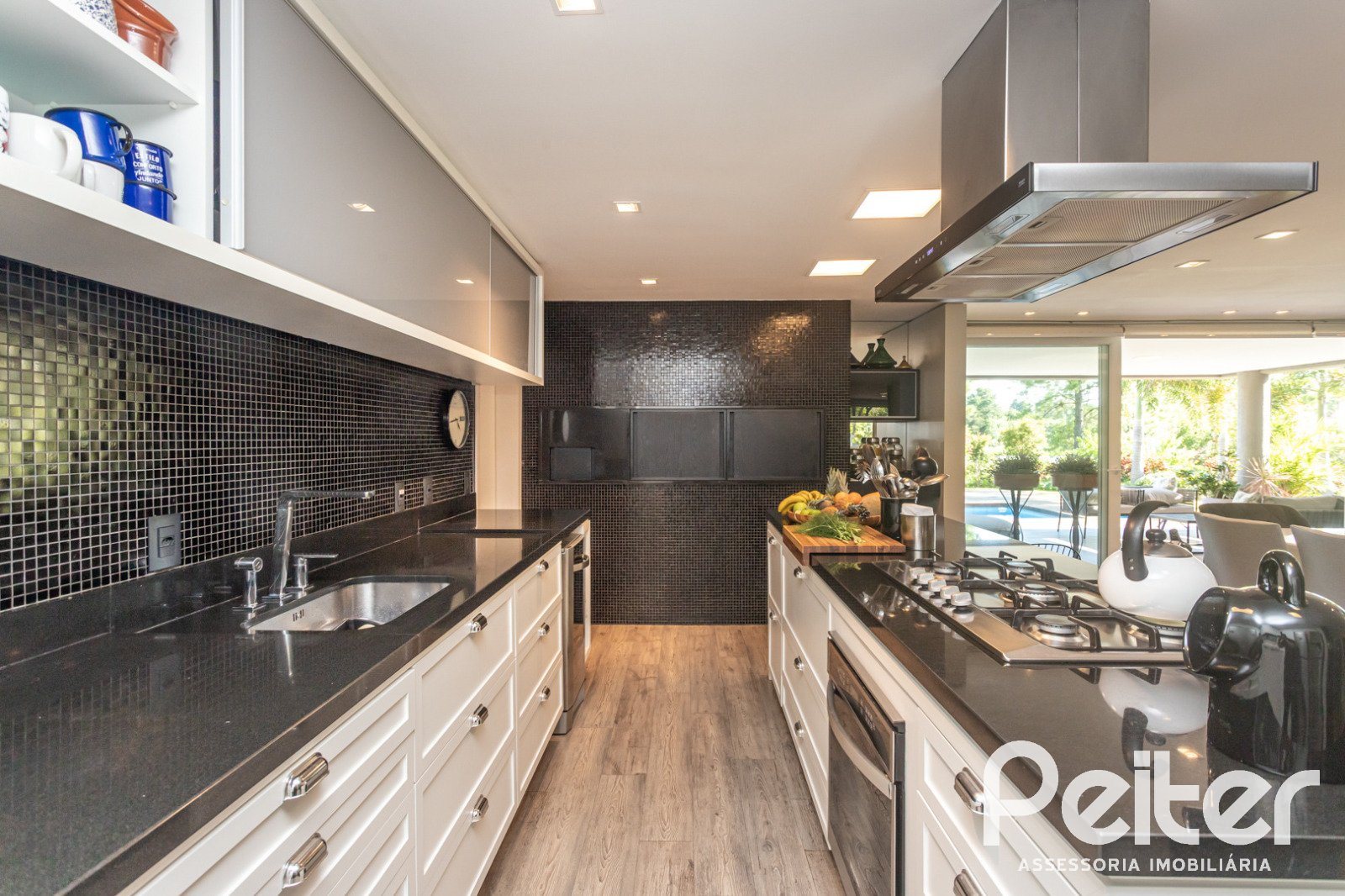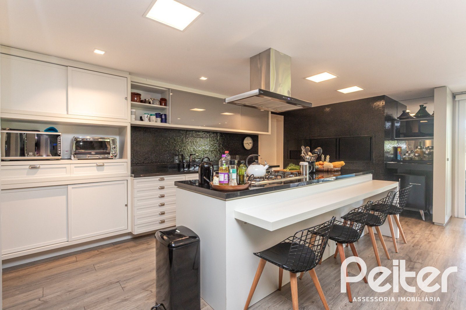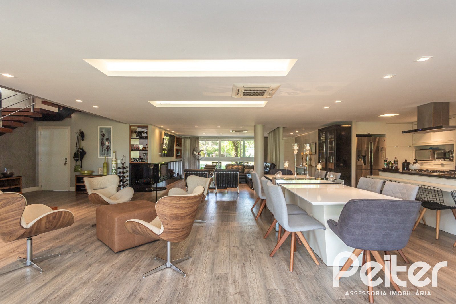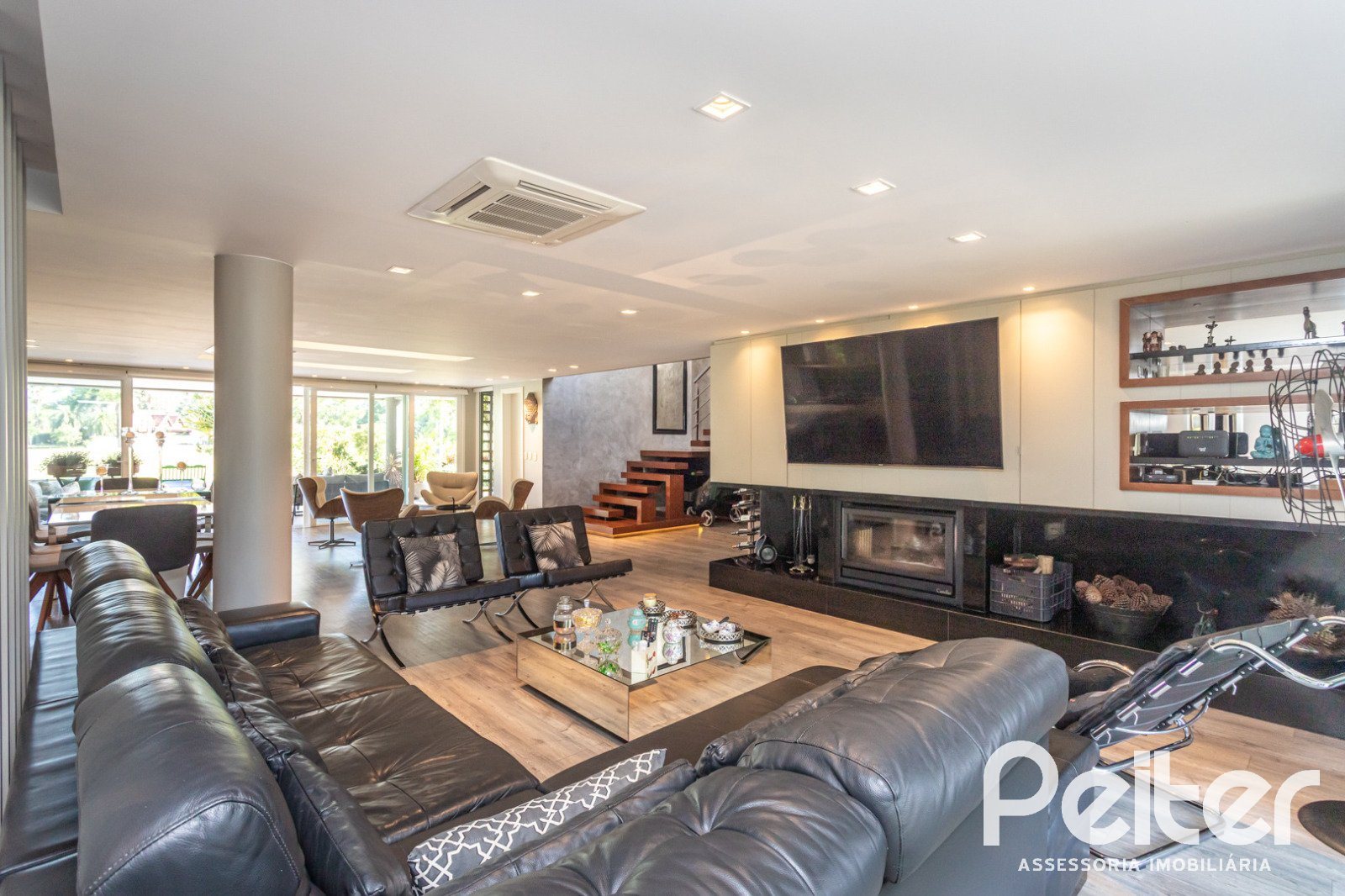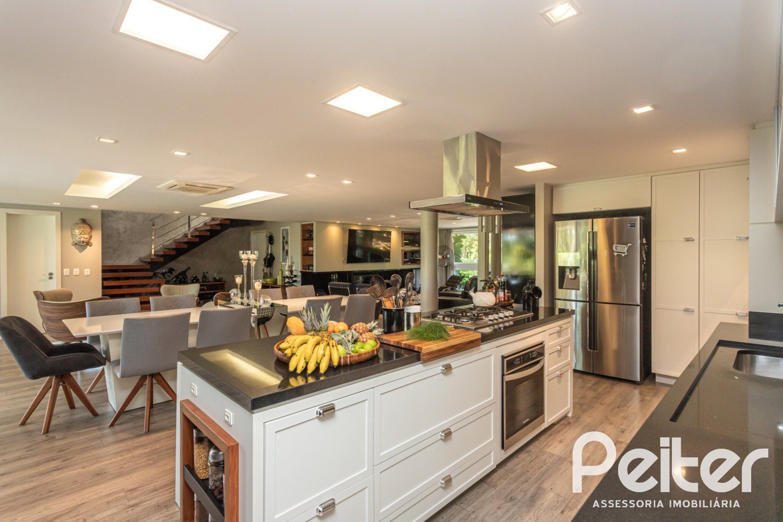 No 1° pavimento: elegante hall de entrada, lavabo, amplo living com lareira, sala de jantar e cozinha em conceito aberto com churrasqueira, área de serviço, dependência para funcionários e banheiro social.