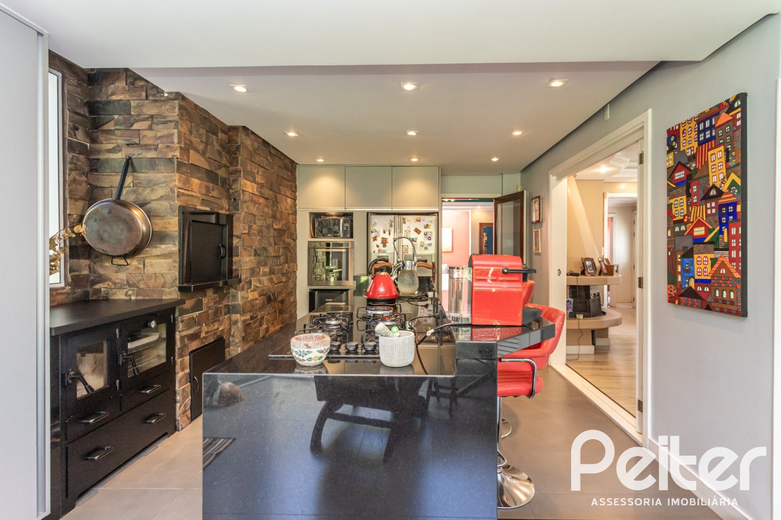 No andar superior, com entrada independente, 01 apartamento com amplo living para 02 ambientes, lareira, sacada, lavado, 02 dormitórios, banheiro social, copa-cozinha e terraço com churrasqueira.