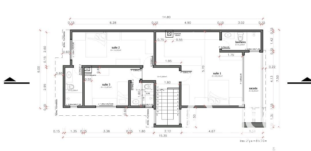 No 2º pavimento: 3 suítes, sendo a máster com 29m² e sacada.