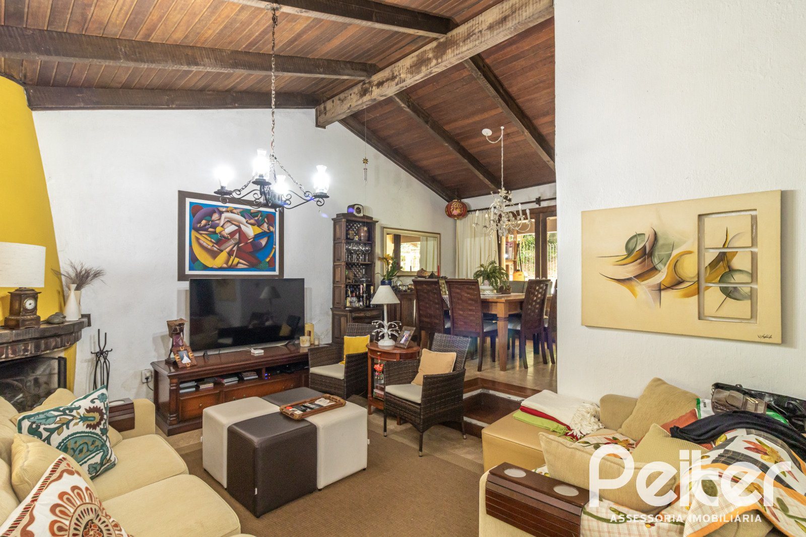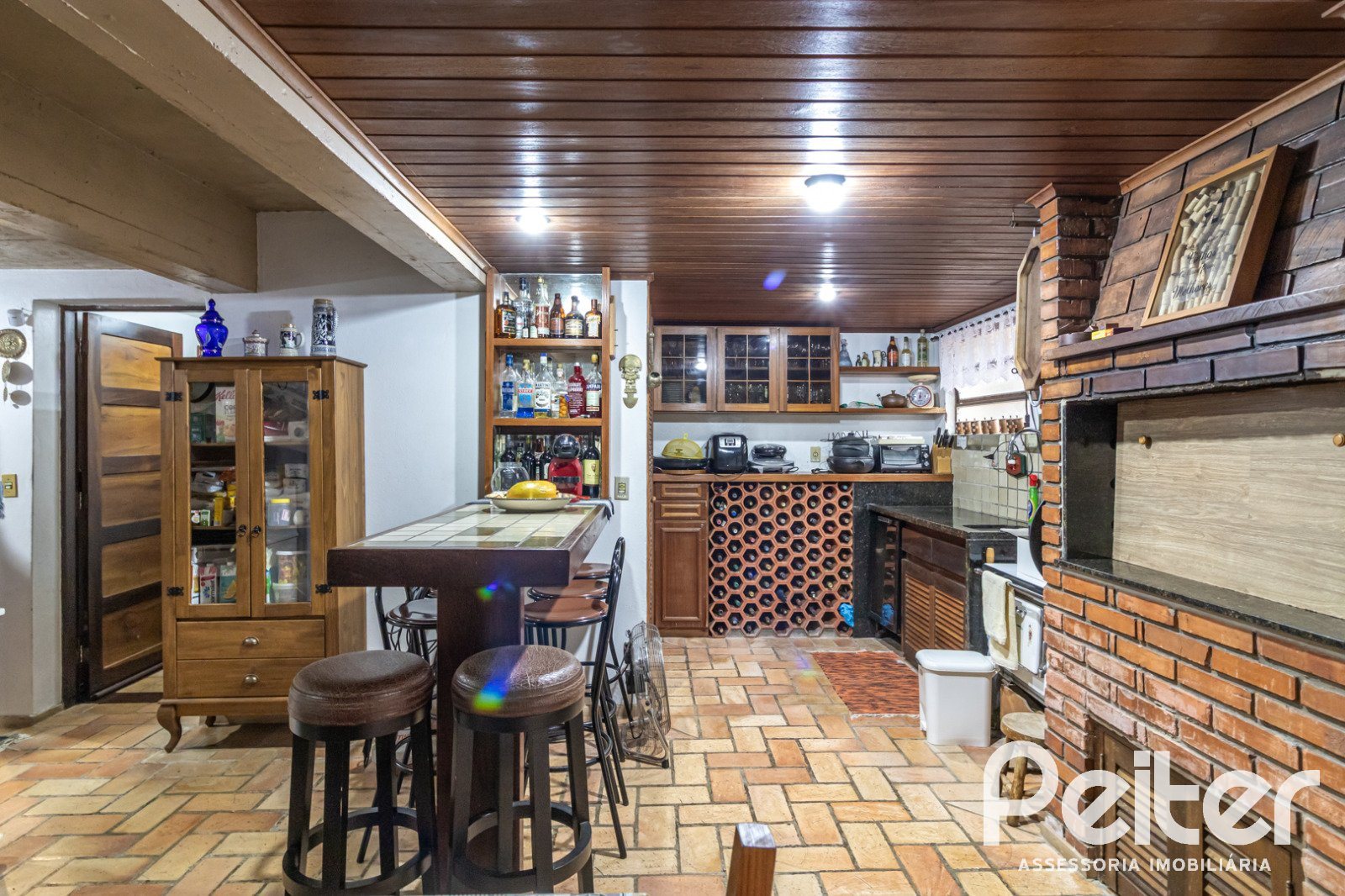 Conta com hall de entrada, living com lareira, lavabo, sala de jantar, copa-cozinha, espaço gourmet com churrasqueira, amplo pátio com piscina.