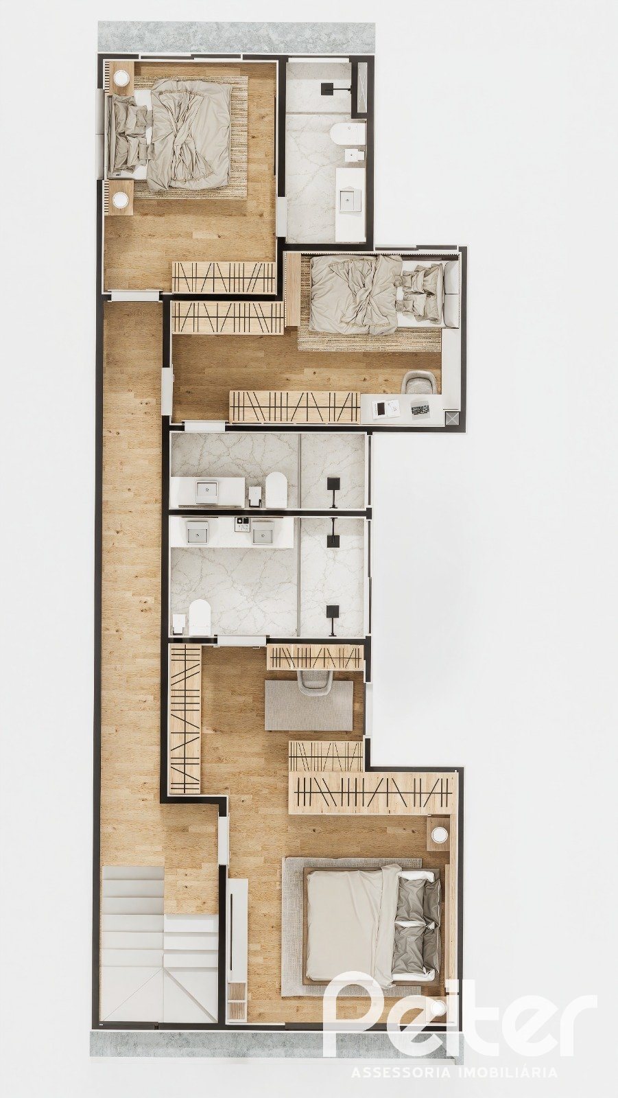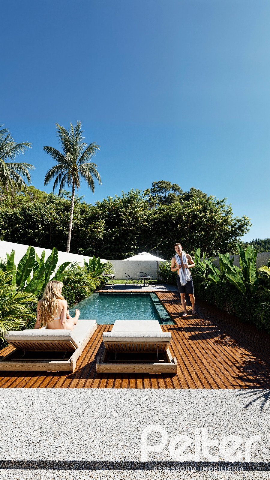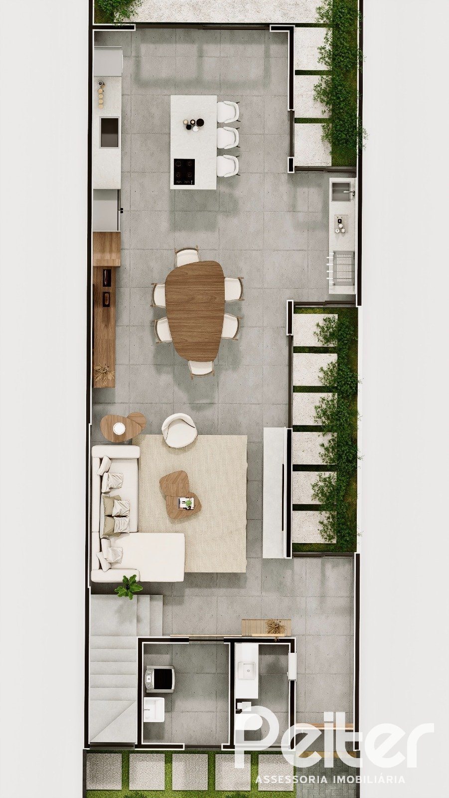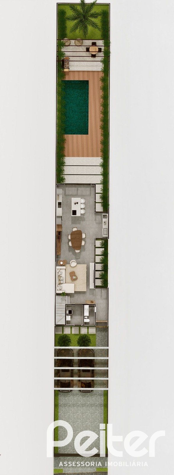 São 203m² de área útil e pátio privativo de 171 m², com piscina opcional.