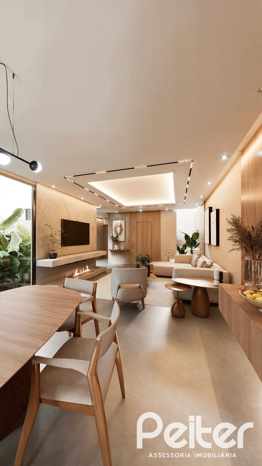 O pavimento térreo oferece living integrado com 03 ambientes: estar com lareira e jardim de inverno, lavabo, sala de jantar e espaço gourmet com churrasqueira ou parrilla.