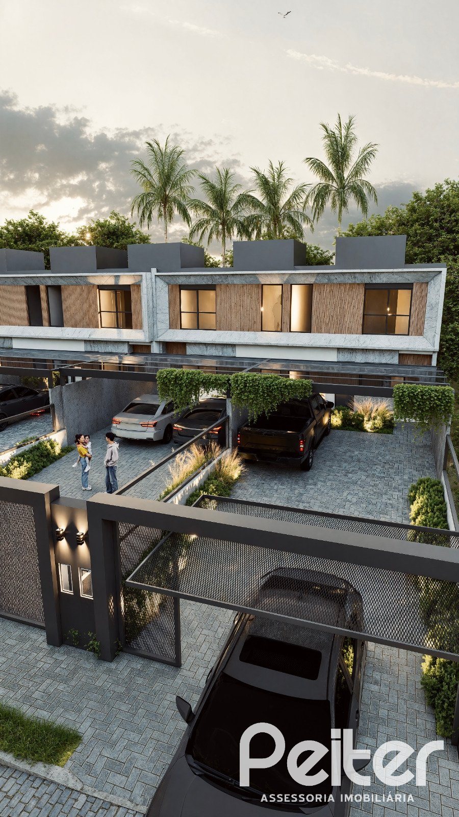 São quatro vagas de garagem em cada casa, sendo duas cobertas e duas descobertas, com espaço para veículos grandes.