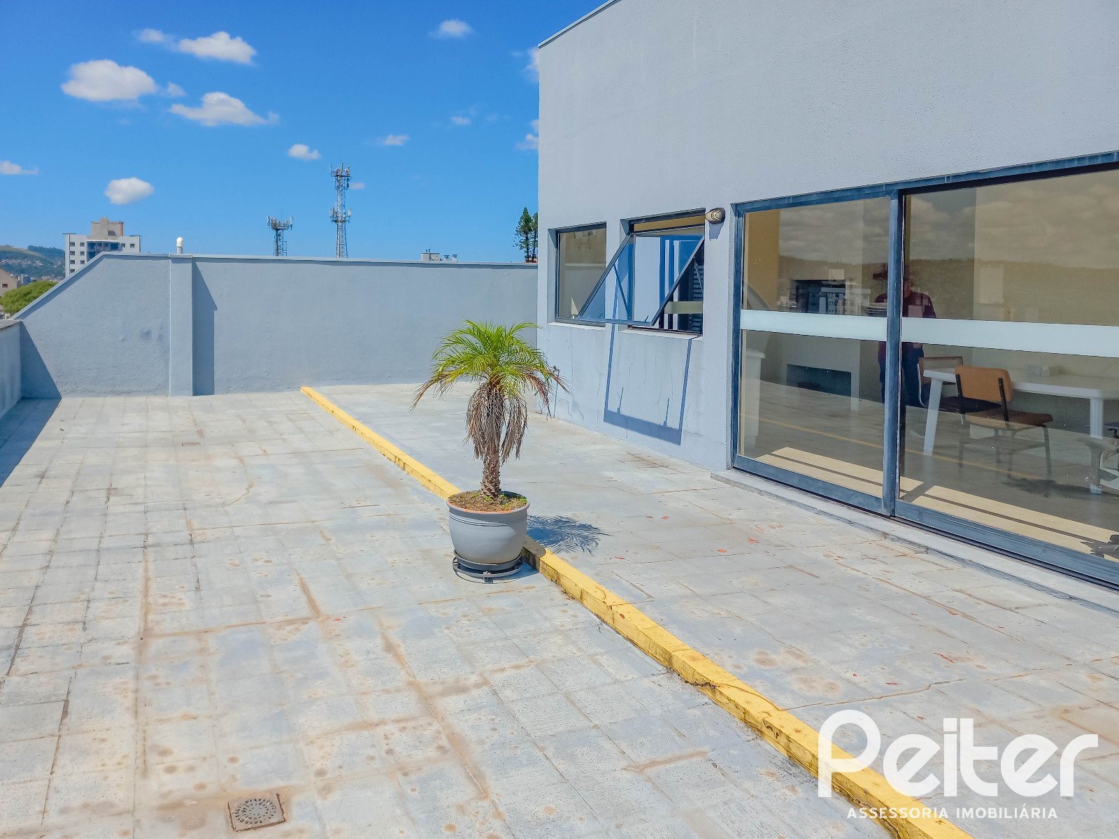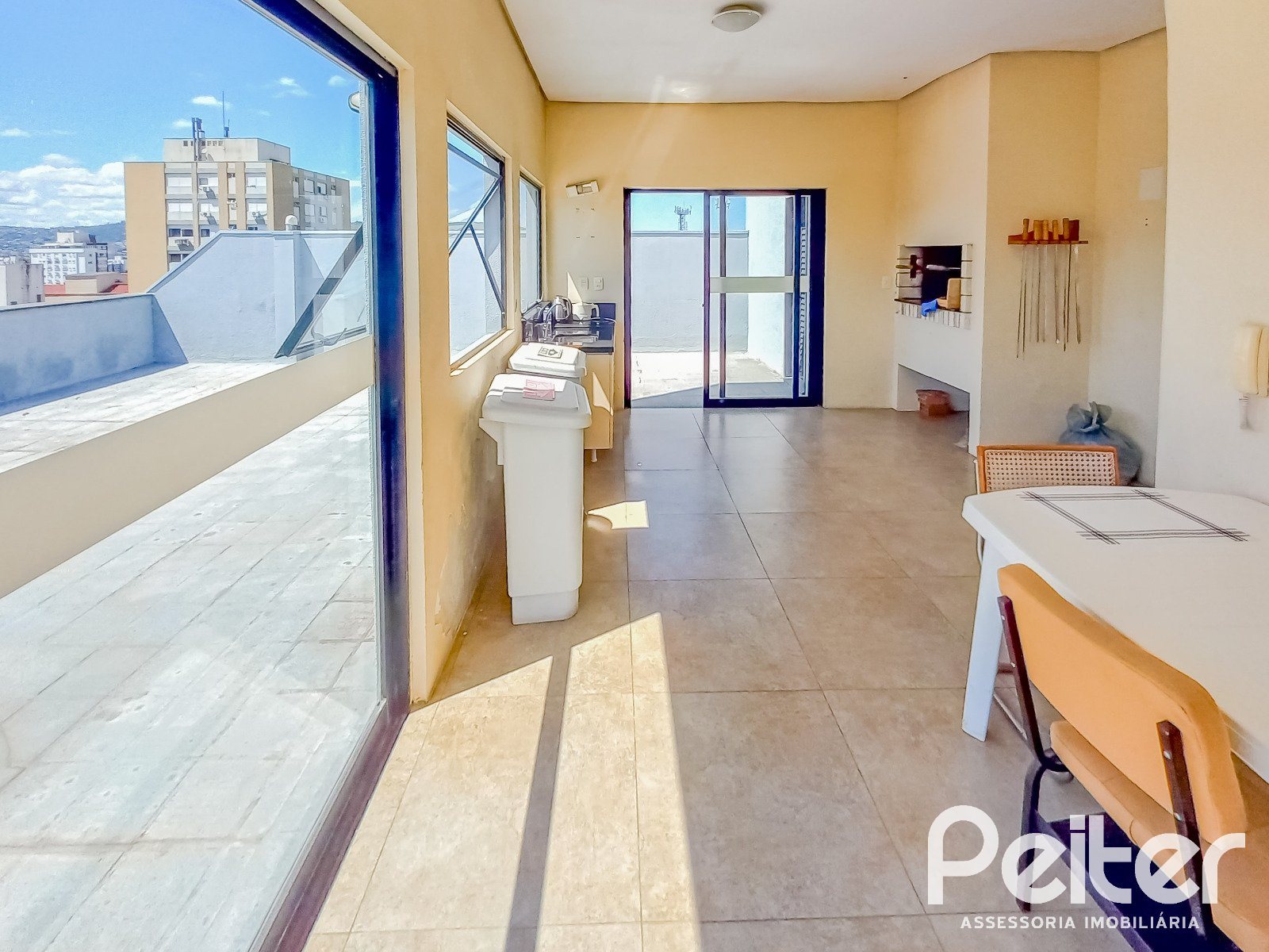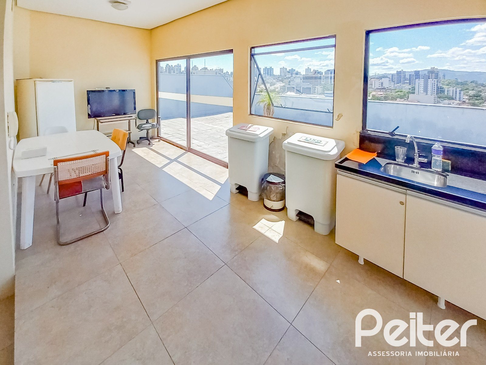 A sala fica em andar alto do prédio, conta com portaria, salão de festas, terraço e auditório no último andar.