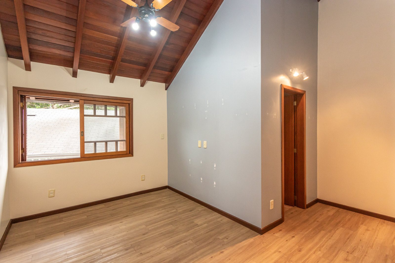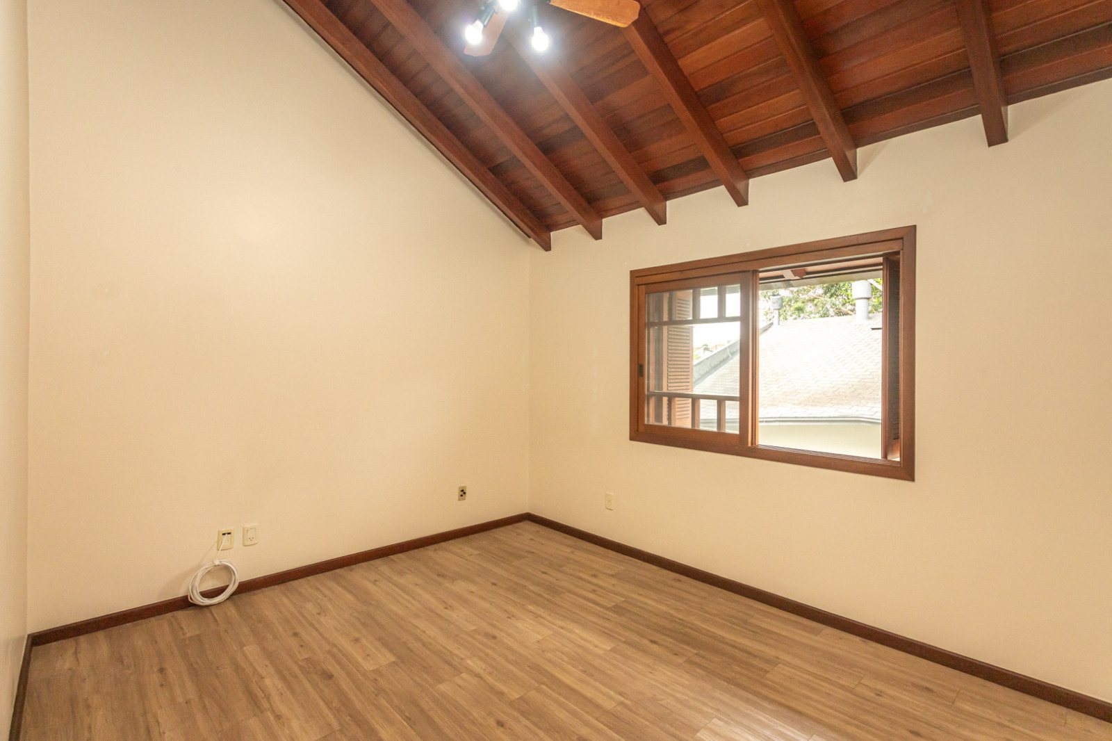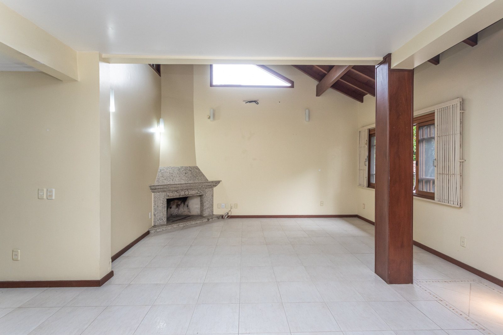 Living no térreo com lareira, suíte, copa-cozinha mobiliada e banheiro social.